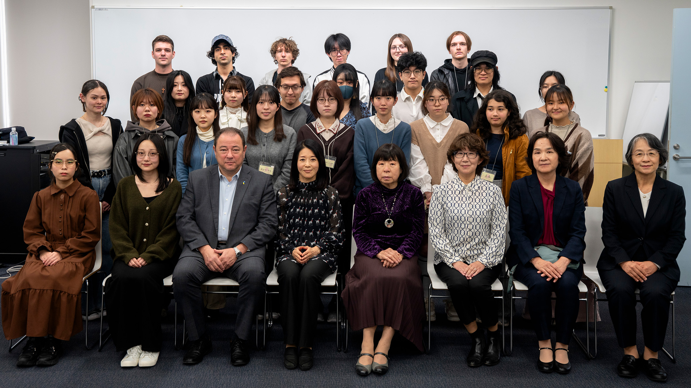 Students and faculty from TUJ and SWU gather for a photo following the Haiku for Peace event. TUJ’s Sergiy Korsunsky (third from left) and poet Madoka Mayuzumi (fourth from left) are seated in the front row.